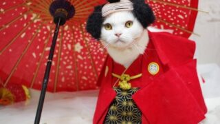 ねこ動画 お正月 ちゃぶ台の上のマグロのお刺身 260101