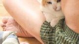 こんにちは。お母さんです。  朝、寝室から出たら、その日その日で違うんですけどにゃんこが待機してます。  みんな大体ごはん待ちで、「早く~」と誘導するように降りて行きます。 が、オデコの場合は、もちろんごはん待ちでスタタタタ~と降りていく時もありますが、 そうでない場合の方が多い気がします。 目的は、背中?(笑) 誰かの背中に。 お父さんの背中に乗りたくて、待ってる場合が多い気がするんです。   この時のオデコは、めちゃくちゃゴロゴロ言ってます  お父さんの背中に乗る前から、乗る気満々でゴロゴロです。 そんな可愛いゴロゴロを聞いて、背中に乗せないはずがないお父さん。 そんなお父さんを、オデコは分かってやってるんじゃない?とさえ思います。 案の定、こうしてお父さんは嬉しそうに背中に乗せて、リビングに登場するのです。 でもオデコは、背中から降りて、娘の方にまっしぐらw  まるでお父さんは用済み、、、とでも言うかのように…。 オデコちゃん、お父さんの使い方、ちょっと雑すぎやしませんか? まぁ、乗られてお父さんも喜んでるからいいんだけども。。。  オデコ