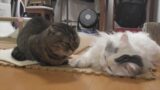 完全なるへそ天!リラックスしちゃってますね!のんびりするのは良いことです!↓Youtubeショート動画ごろ寝してる時はだいたいへそ天が多いラムなのです!レオンは、足元でキチンと座って何か待ってるようですね。短足にゃんが足を揃えて座ってる格好って好きです💓放置していたら、隣りにやって来ました!構って欲しかったのかな?↓Youtubeショート動画甘えたくなったのかそばに来たので、お箸でナデナデwww
