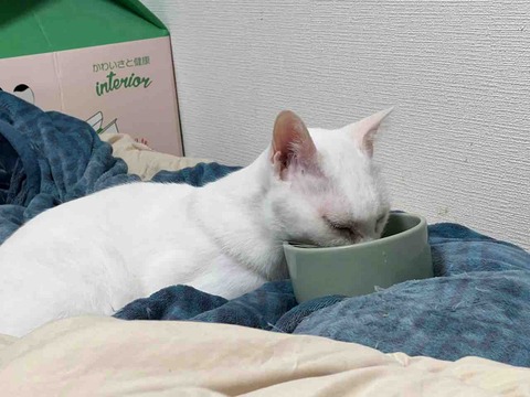 麿白先生は30度くらいのぬるい水が大好きです。お湯…お湯だね…めっちゃうまいね…ガブガブいけるね…。大好きでもテンションは低め。ケージに水皿入れてそれも飲んでますがお湯がやはり格別なようです。いやぁ…ぬるめのお湯は…五臓六腑に…染み渡るね…。好物を摂取したとき特有の悪い顔。これは腎不全の副作用の多飲多尿、そしてテルミサルタン(セミントラ)の副作用でもあります。なにしろ猫の腎臓のためには水を多く飲ませることは必須です。あんちゃんお湯はそんなにおいしいのかゃぃ?琥麦も当然お湯大好きになりました。猫に水を飲ませるときのコツ?は食べ物とは別の場所にすること、人肌くらいにすることだそうで。ケージの場合はしょうがないですね。参瑚もテルミサルタンを飲んでるので多飲多尿になりました。なので、とにかく猫砂の消費量が大変なことになってます。システムトイレについては、麿白先生は使いますが参瑚は使いません。暁璘は飲む日とそうでない日がなぜかはっきりしてます。それぞれ水を飲む量を気にしないといけないので、通常与える水のほかにこういうお手製のぬるま湯がそれぞれのご馳走になってます。これには特に何かを加えるということもしていません。//pagead2.googlesyndication.com/pagead/js/adsbygoogle.js