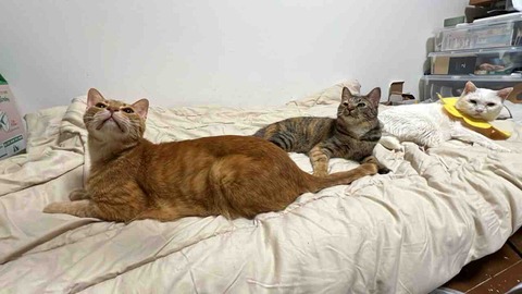 参瑚が前に出てくるようになったのと、新しいおもちゃをえらく気に入って遊ぶようになったので、かつてゃ珍しい組み合わせが当たり前になりました。3匹そろってキナコムギリンズです。暁璘は前には出てくるもののおもちゃにたいしては「…?」という反応のため、琥麦と参瑚がハイテンションで走り回ってるのを眺めるだけです。そして参瑚のスイッチが入ってると琥麦のことがほぼ眼中にありません。そしておもちゃが暁璘の方に行くとおもちゃではなくて暁璘に仕掛けます。ここではじめて暁璘も応戦しますがもはや勝ち目なし。きなこもちがいるとコムギスペシャルができないゃぃ…!琥麦が狙いを定めて行こうとしている時に参瑚が横取りするさまは、参瑚におもちゃを横取りされる時雉そのまんまです。まったく、一家の主猫たるぼくが入れないのは極めて遺憾だね。おもちゃに反応していこうとしても琥麦に仕掛けられて追い出される麿白先生。うまくおさまってませんが、遊んだ後はこういうキナコムギリンズの三連添い寝も発生しています。猫たちの関係性の変化が目まぐるしい春です。//pagead2.googlesyndication.com/pagead/js/adsbygoogle.js