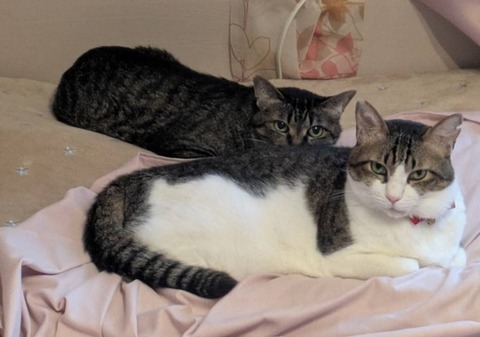 我が家で濃い半年を過ごした騎士団長猫・マリオンくん。期間後のマリオンくんとシェリーさん。マリオンくんは里親様の元に帰還してからまた表情が別猫になったのが印象的でした。姫を守る騎士団長猫の後は幼猫を見守り保育士猫に一時転職。おろおろとする感じで間違いなく幼猫は初見でしたけどそれでも何かしようという気持ちは感じ取れました。モナさんの護衛をするのと同様、本能で守るべき存在というのがわかったのかもしれません。[youtube https://www.youtube.com/watch?v=xoQKd9TRjCA?feature=oembed&w=560&h=315]モナさんも最初はシャー!でしたがあとは距離をとって見守ることがほとんどでした。モナさんもどうしたらいいかわからないという心の動きが見て取れました。黒イモ兄妹が基本的に2匹で遊ぶだけであまり絡みに行くタイプでなかったのはよかったかもしれません。里親様宅の庭に現れたという不逞猫に警戒するマリオンくん。そうして里親様やモナさん、シェリーさんを守ってくれているようです。一方でモナさんはびっくりして怒りまくったそうですが。モナさんと麿白先生は似てるかもしれません。モナさんに冷たくされがちらしいマリオンくんですが、心から甘えられる現在は幸せですね。うちではなんだかんだですごく気を遣ってたように感じます。//pagead2.g