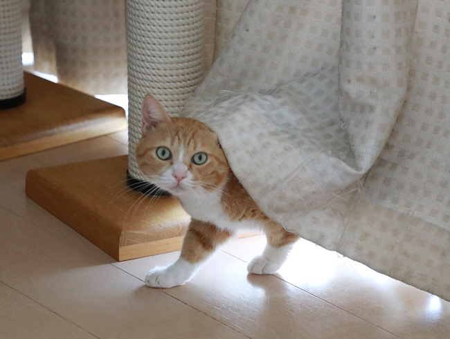 カーテンから顔を出した状態でライバルたけの動きをじーっと観察。爪切り係のたけに