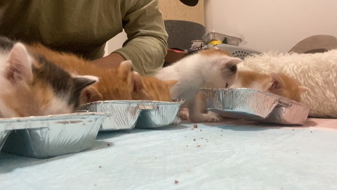 子猫を育てるには共通して必要なものがある中で、我が家では独自の育成方針で必要なものがいくつかあります。それがこのフード皿。子猫ひとりなら当然必要なく、ふたり以上の兄弟姉妹となると並んで食餌をさせるのが重要という考えなので必須になってます。競わせる事で偏食をなくす、食欲を増す、食べ方を覚えるなどなどいい事尽くしです。こちらは皿がなくなってしまい、その容器で与えている場面。これはSeriaのバーベキュー用タレ皿なんですけど、深さといい隙間といい500gくらいまでの子猫にはちょうどいいんですね。使い捨てなので楽ちんです。一方で、バーベキュー用タレ皿なんて限定された場面でしか使われないので需要なぞ推して知るべし。つまり私が一番買っており、買うとしばらくその店から在庫がなくなります。これがない時は使い捨てお弁当用の刺身の醤油皿を使います。そんな感じでこれくらいの子猫たちがやってくる局面というのは普通の人にはありません。このふかふかクッションも我が家には必須になってます。夏でもこのふかふかに埋もれる子猫たち。母猫がわりになってくれます。あとはこの体重計測用のウェットティッシュの筒。暴れるタイプの子猫には不向きですがこれは600gくらいまで入ります。これに入れてキッチンスケールで測ります。未だに2015年の最初に使ったものが現役稼働中です。そして子猫の成長が軌道に乗る頃にはお役御免でまた次の子猫