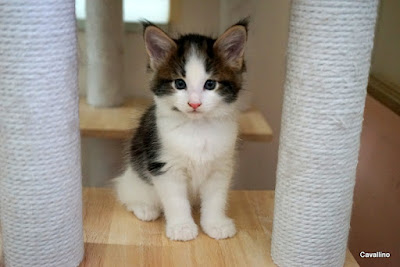 <はじめておいでの方へ> メインクーンキャッテリーCAVALLINOへようこそ。日々の出来事や子猫情報などを綴っています。大家族ですので、わが家の家族紹介No.1とNo.2をご覧下さい。ペトハピ 太鼓判ブリーダー に掲載されました。クリックすると見られます。子猫たち生後1か月半になりました。まだまだ免疫力も弱く体力もない。神様からこの世の滞在許可を頂くまでにはもう少し。薄氷の上を歩く気持ちでしたが・・・・氷の厚さが増してきたかも。生後40日に撮ったポートレートです。ブラウンタビー&ホワイト ♀お父さんのサファの姉妹のアメちゃんにそっくり。性格もちょっとシャイで穏やか。ブルーパッチドタビー&ホワイト ♀お母さんのファーファによく似ている。しっかり者で逃げ足の速さは天下一品(笑)シルバーパッチド
