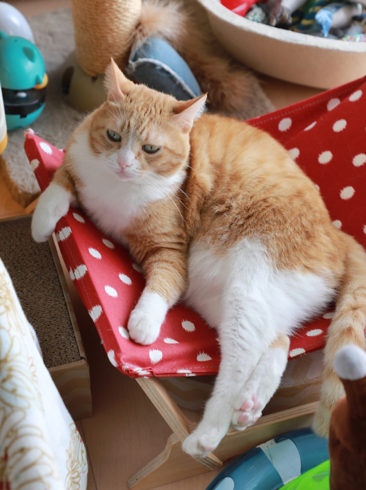 朝ゴハンをちょびっとつまんで窓辺で日光浴を終えたユウがハンモックでだらだらしながら耳をぴくぴく。アミ姐さんはどこだろうと思ってる?いつもなら人間たちと一緒に起きるアミが
