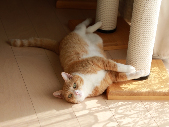 熱々になったユウが遮光カーテンのこちら側にごろん。起き上がるのが面倒なのか勢いをつけて上半身をぐいっと起こしなかなか切らせてくれない大事な爪を