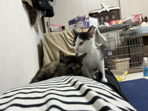 4LDKで独り暮らしの我が家ですが、猫がいる部屋の分、寝床があります。実質全てが猫部屋猫空間でそれぞれ目的を持って部屋を分けているので、一番手っ取り早く共に時間を過ごす手段が「一緒に寝る」なんですね。あとはこちらの腰が悪いという事情が大きいのです。ずっと座ってるだけは腰に負担がかかるのと座椅子は何故かすぐに嘔吐されたり表面の生地を破壊されるジンクスがあります。マットレスも嘔吐はされますけど二重三重にボックスシーツと敷きパッドを重ねてごまかし、もし嘔吐されたら適当に綺麗にした上で翡文のスプレー避けに格下げです。楽天のセールはその辺の買い足し時です。実際、添い寝でなければ猫たちはそれぞれの猫ベッドで眠る方を好みます。固めのマットレスは子猫たちの運動場でもありますね。跳躍前の子猫は硬い床の方が良くて、跳躍をするようになったらラグかマットレスを敷いた方が良いのかなと思ってます。メインは居間で、麿白先生と琥麦の添い寝です。それぞれに眠るので睡眠は結構細切れです。熟睡知らずなのは猫と暮らす者の宿命でもありますね。//pagead2.googlesyndication.com/pagead/js/adsbygoogle.js