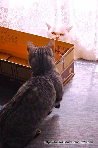 箱を挟んで睨み合うラムとルナ!ルナが近づくと、ラムは怒って逃げて行く!こういう時ルナはラムに噛みつくからだ。デスクに移動したラムは、動くカーソルに釘付け!キョロキョロと目で追う!でもじきに飽きちゃった!主の指を舐めてくれる。お返しに撫でてくれるのを知ってるから。いつもこんな感じに甘えるラムなのです。さて、オヤツにしましょう!おやつは譲れないので、同時に舐める!勢い余ってルナの舌に噛みついちゃったレオン!ルナが悲鳴を上げた!それでも止められない!止まらない!袋に噛みついて離してくれない。↓Youtubeショート動画一緒におやつ食べてたら、ルナの舌に噛みついちゃったり、オモチャには何でも噛みついちゃうレオンなのです。さて、ちょっとレオンくんと遊んでみましょう!ウサギの毛の猫じゃらしは、つい噛みつきたくなるけど、なかなか捕まえられなくてちょっとストレス?!噛みつくと一発で壊しちゃうので、そう簡単には渡せない!駆け引きをしながら遊んでました。↓Youtube動画オヤツはラムにもちょっとはあげないとね!偏食で小食なツッチーだけど、オヤツはスゴい勢いで食べる。オヤツばかりじゃ栄養にならないからご飯もそのぐらい食べてくれないかしら?(苦笑)