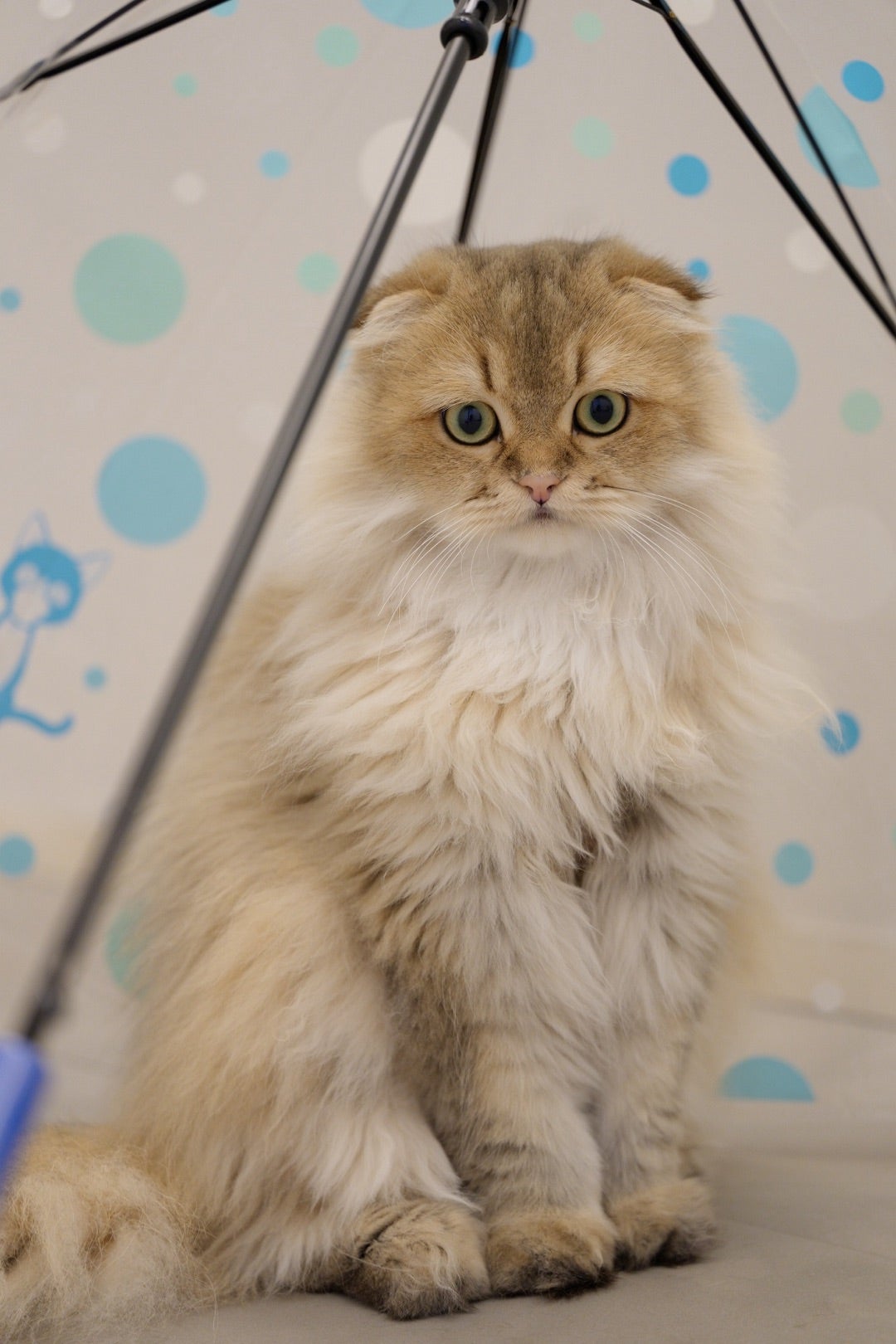 玄関で開いてる傘の下にいるレオくんは、 取っ手の部分を、ふんふん、ふんふん。 念入りに匂いチェックしたあとは、 二本足で立っててっぺんの部分をチェックします。 チョイチョイ、チョイチョイ。 何か気になることでもあるんでしょうか? レオくん「水滴がついてました。」 コロンママ「雨だったからですよ。いま干してるんです。」 レオくん「ふ~ん、そうですか。」 水色の水玉模様が似合うレオくんは、 今度は外側からじーっと見ます。 そして勢いよく傘かじりするのでした。