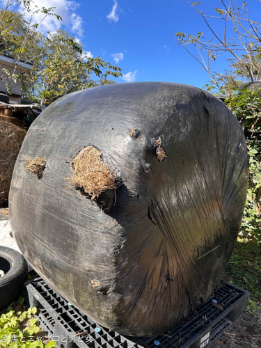 昨日の朝 馬の世話をしに外へ出たらラップされた予備の牧草が飛び出してた。