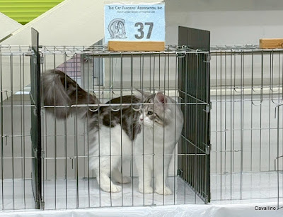 <はじめておいでの方へ>メインクーンキャッテリーCAVALLINOへようこそ。日々の出来事や子猫情報などを綴っています。大家族ですので、わが家の家族紹介No.1とNo.2をご覧下さい。ペトハピ 太鼓判ブリーダー に掲載されました。クリックすると見られます。先週末ですが、キャットショーに行ってきました。今回は名古屋遠征。お供は・・・・・・・「ココドコ?」タレンティです。何しろ穏やか。おでこに「平常心」って貼ってあるの?そう言いたくなるくらいぼ~~~っとしています。「動かざること山の如し」何だかお尻が重いのか、座っている事が多い。反応しないわけじゃないんですが、反応が微妙に遅い(笑)日本に来てまだ1か月半。それでも大きくなったなあって気がします。褒められているんですが、本にゃんわからず。きょと~~ん。「タレンティの勲章」タレンティ、グランドチャンピオンになりました。このところ出場する猫が少なくて、不安でしたが。よかったね。お疲れさまでした。 ランキングに参加しています。バナーを2つポチッと押していただけると嬉しいです。頂いたコメントは楽しく拝見させていただいております。ブログを書く励みになっていますが、個別にお返事するのをお休みさせてもらっています。それでもいいよ、という方コメントをぜひお願いいたします。初めての方