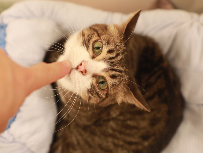 たけが差し出す指先を律儀にすんすん。細長いものを嗅がずにはいられない猫らが可愛くて