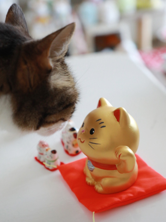 片付け中に発掘された箱や包みを開封していたら音を聞きつけてアミ参上。出てきたのは招き猫いろいろ。福を呼んでくれそうな招き猫は