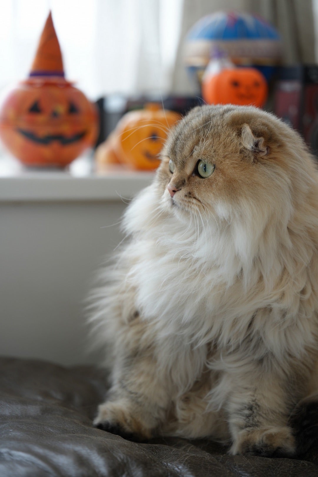 ハロウィンまであと1週間の金曜日に、窓辺のジャックオーランタンと一緒に撮影のレオくん。 コロンママ「そういえばキャンドゥで買った猫ちゃん用ハロウィングッズがあるので見てみましょう。」 レオくん「もしかしてこれを着るんですか?」 コロンママ「そうですよ~。」 330円商品にしてはなかなかしっかりしてるのかも? コロンママ「裏側は思いっきり不織布なのでアレなんですが、表は悪くないですよ。」 レオくんはマントのひもをチョイチョイしてから、 着てみたけど思いっきりしょっぱい顔です。 (どうしたの???) なかなかリアルな顔の魔女とか怖い顔のジャックオーランタンが気になるマントですが、 お帽子もセットで着てみたらレオくんがオシャレな魔法使いに見えちゃいます。 レオくんは唐突に立ち上がって踊ってるみたいに見えますが、 お座りしたらとってもいい感じのハロウィンコスプレですね。 コロンママ「お帽子にティッシュで詰め物をした