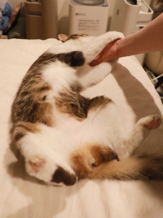 アミが可愛いんだよー!(うん、わかってる)と呼ばれ、カメラ持参で撫でに行くと私のベッドでへそ天になっており(まいど)