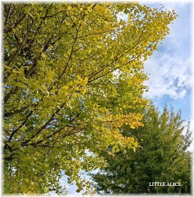 黄色く色づいているイチョウの木とまだ青いイチョウです。