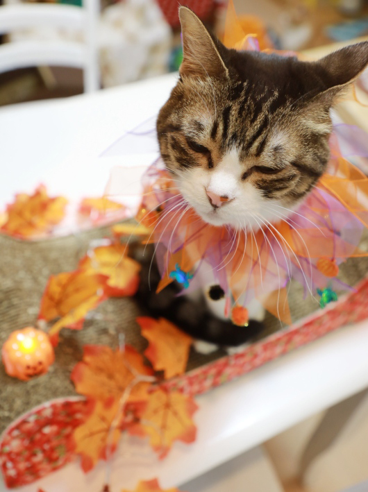 起きたばかりで目が開かず。ゴハンの残りをつまみ始めるハロウィンの妖精さん。首飾りをケリケリし始めたので外しましたよ。首飾りを警戒して遠巻きだったビビりん坊ですが新しいハロウィンの電飾にたまらず接近。電飾好きの購買部長たけが