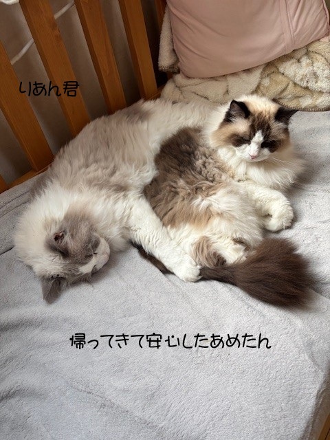 昨日、あめたんとオルくん病院へ行ってきました。結果「細菌性の膀胱炎」でした。ストルバイトじゃなくてよかった~。ビビりながらレントゲンと注射をしてきたあめたん。家に帰ってきて安心したようです。お薬は一週間。昨日、注射しただけで頻尿行動がなくなったのですぐによくなると思います。そして、オルくん。風邪症状なのでインターフェロンの注射。点眼二種類と抗生剤を一週間。昨日点眼がんばったので涙目は軽減。まだ鼻が良くなってないけど点眼をがんばるしかない。もうね・・昨日はブログ更新してからハローワーク。帰ってきてすぐに病院の予約をいれ、あめたんとオルくん連れて病院へ。帰ってきてから夕飯の下準備をしてから今度はよーにゃんの「発熱外来」はなぴんばあさん・・・疲れました💦で、よーにゃんはコロナとインフルの検査をして陰性。お薬もらって帰ってきたけど昨晩も熱が上がり、寝れなかったよーにゃん。朝、体温をはかったら39℃超え(゚Д゚;)朝から39℃超えってやばくない?これで、インフルじゃないの???検査するの早すぎたのかな💦☆;+;。・゚・。;+;☆;+;。・゚・。;+;☆;+;。・゚・。;+;☆;+;。・゚・。;+;☆久々みた機関車めいぷる。新しいタワー買ってあげたい・・・お外を見てるろぜandこりゃる。そこへオルくんが無理やり真ん中に。他の子だったら怒る所なんだけどろぜちゃんと