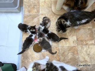 <はじめておいでの方へ>メインクーンキャッテリーCAVALLINOへようこそ。日々の出来事や子猫情報などを綴っています。大家族ですので、わが家の家族紹介No.1とNo.2をご覧下さい。ペトハピ 太鼓判ブリーダー に掲載されました。クリックすると見られます。昨日の「食欲」つながりで・・・・・子猫たち順調に成長中。何もなく2か月半まで育つって本当にありがたい。食欲は寒くなってきたから増したわけじゃなく、最初からよく食べる子たちです。これは1か月ちょっと前の写真です。それが今では・・・・・・・「黒山の子猫だかり」もうお皿が見えません。お母さんと比べて見ても大きくなっているのがわかります。以前と同じお皿ですが、与える量は倍になっています。「お皿を2枚にしないの?」って思う方もいるはず。それでもいいのですが、競争して食べる方がいい感じに食べる。上の写真で離脱したルル。結局また戻ってきて食べている。そして男の子のオーディン写真の撮った角度もありますが、大きくなったでしょう?なんだか大人猫みたいに見えてしまいます。今回の子猫たちはウェットもドライも大好き。朝晩2回ウェット。5匹で200g以上。その他にドライフード+Feline naturalそれをペロッと食べるから、すくすく育つはずだ。ヤギミルクも好きですね。本日のお・ま・け♪大きな女の子のスペースと水飲みを交換