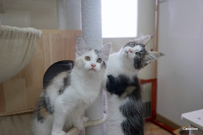 <はじめておいでの方へ>メインクーンキャッテリーCAVALLINOへようこそ。日々の出来事や子猫情報などを綴っています。大家族ですので、わが家の家族紹介No.1とNo.2をご覧下さい。ペトハピ 太鼓判ブリーダー に掲載されました。クリックすると見られます。ファーファとサファの子猫たち生後2か月半を過ぎました。子育ては毎回違う。うまく行かなくて泣きたい時もあります。でも、今回は拍子抜けするくらい順調。お腹を壊すこともなく、しゃみや熱も出ない。まあ、贅沢を言わせてもらえば・・・・・もう少しなついてよぉ~!猫たちの群れで走り回っております。オーディン♂とラーラ♀。ラーラは「超」がつくほど人懐こくて・・・・やんちゃ娘。足にまとわりつくから、踏んじゃいそうで怖い。オーディンも人懐こいけれど、ラーラには負ける。ロキ ♂食欲大魔王。最初はオーディンより小柄だったのですが、追い越したかな?リュリュ♀一番お母さんのファーファに似ている。ものすごい慎重な性格。ルル♀慎重で怖がりだと思っていましたが・・・・・ものすごい好奇心の塊。好奇心が毛皮を着ているような子です。さて・・・誰を残すのか?お家募集なんて忘れちゃっていた。ページを作ってもらわないと。本日のお・ま・け♪「ネエネエオカーシャン」まだまだお母さ
