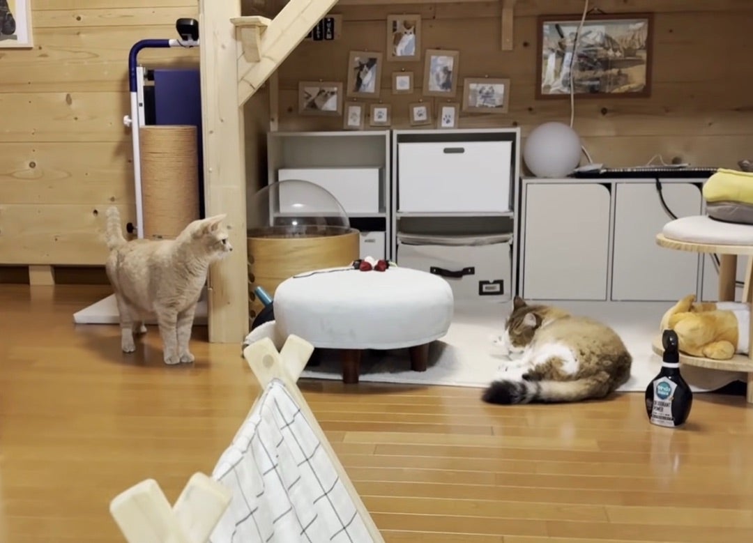こんにちは。お母さんです。もう、何年になるか、ひのきは秀吉が苦手なようです。嫌いなのか、はたまた実は怖いのか、理由は分からないんですけど、見かけると怒りながら離れて行きます。それを見た秀吉がまた追いかけるから、余計怒られると…。まぁ、後から付いて行く姿はかわいいんですけどね。でもこれ、人間やったら、、、マジで気持ち悪いやつですだからひのきは、こうなるw秀吉は悪気ないかもしれないけど、悪気なかったらええんか?って言われると、嫌がってるんやからね、ダメでしょって話で。まぁでも、この光景、見ててちょっと笑っちゃうんですよwひのきには悪いけど。悪いと思うから、あんまり秀吉がしつこかったら止めに入るんですが、今回はまだそこまで追いかけてなかったんで見守ってたんです。でもまさかひのきが、化け猫まがいのことをするなんて(笑)秀吉が嫌すぎて、本性を現すしかなかったのか賢すぎてビックリしたお母さんたちですwwおてては大丈夫そうです。かわいいおててに何かあったら、お母さんも困りますひのきは秀吉一家に人気なんです。そして一目置かれてることも事実で。ひのきの部屋に安易に入って来ないってことがそれを証明しているように見えます。そんなひのきは息子のことが大好きで、息子の影に隠れて寝てる時が、1番安心安全と思ってるみたいです。それは多分間違ってない。ただその姿が可愛すぎて、どうしても撮りたくなるお母さんたち。ご