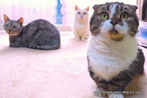 レオンたちがなんとなく集まっているので、退屈しのぎをしてあげようと、ライトに手を掛けました!するとみんなの視線が集まります!ツッチーがサッと動き出したら、ルナとラムはジッと動かない。次にラムが走り出したら、ルナとツッチーは見てる。同時に動くと、ぶつかったりケンカになったりするのをいつの間にか学習したようです。レオンとラムは付き合いが長いので、同時に手を出さないようにしているみたいです。↓Youtubeショート動画いっぺんには遊ばず、自然に交互に遊んでいるようです。ケンカにならないよう、ルナには別に遊んであげる必要があります。単独でお相手してあげてるのに、なかなか動き出しません!独りで遊んであげても、大胆な動きが出来ないルナなのです。↓Youtube動画まだ何もしてないうちから動き出すツッチー!見えたような気がして、フライング気味に動き出したようです!はい、こっちですよ!今日はツッチーの動きが速いようです!誰かが動くと、他の猫はちょっと遠慮気味。たぶんそれがこの猫たちのルールみたいです。でもラムが動き出したら、ルナが叩きました!ルナはまだ学習出来てなかったようですね😥ツッチーが去った途端にラムが遊び出す!ツッチーが戻ると、またラムは控えに。よく心得ているのはラムなんだわ!www