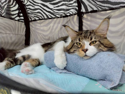 <はじめておいでの方へ>メインクーンキャッテリーCAVALLINOへようこそ。日々の出来事や子猫情報などを綴っています。大家族ですので、わが家の家族紹介No.1とNo.2をご覧下さい。ペトハピ 太鼓判ブリーダー に掲載されました。クリックすると見られます。猫だっていやな事は覚える。「またか・・・・・」この表情。空はとてもいろいろな事を感じ取る子です。ずっと楽しくショーに出てきましたが、覚えちゃったんですね。「いつも同じことの繰り返し」だって。好きな事には反応するけれど、嫌いな事には反応しなくなった。ジャッジさんに違うおもちゃを出させるってどうよ?「違うのがあるだろ」って顔で(汗)空、お父さんとそっくりになってきたね。dinoのつぶやき人間もそうだと思うのですが・・・・相手が自分を好きではないってわかりますよね。動物は言葉がわからないから、相手の動作や態度で感じ取る。空はお父さんのラピスとよく似て、とてもよく感じとる。ジャッジさんの雰囲気や扱いで好き嫌いがものすごく出る。顔を見ただけでぶちぶち文句を言って終いには「シャー」(汗)でもそれを責めることは出来ない。だって・・・・相手が嫌っているのを感じ取っちゃったから。大好きなジャッジさんにはベタベタで何でも言う事を聞く。それを見ちゃうと、無理せず出せる所だけって思います。 &nbs