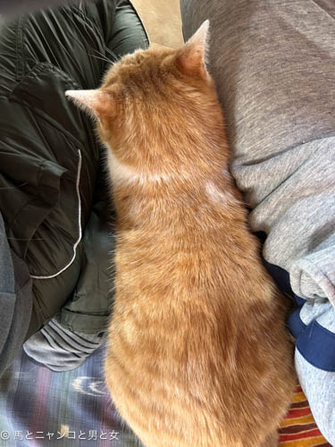 ねこ画像朝ごはん時 ちこ太郎との間に割って入って温まってる「まっちゃん」。「オトじい」もσ(^^;)の股間を利用して温まってる。