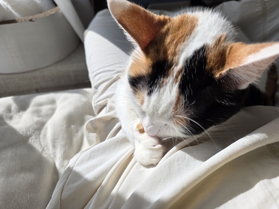 リリが膝の上・・というか、お腹の上・・?に乗ってる。その時、ララは・・あれ?あれれ・・?目を細めて見・・・・なくても、分かるかwそんなララの所へ突入したリリ。ララ「邪魔だなぁ・・」そんな声が聞こえた。同日。天気が良かったから、窓辺が気持ちいいね。そういえば!腕の毛が少し復活してきた気がする!生えろーーー生えろーーー念じておく。つーか、毟るなーーー!!!!毟るなーーー!!!!こっちをを念じた方が良いか。
