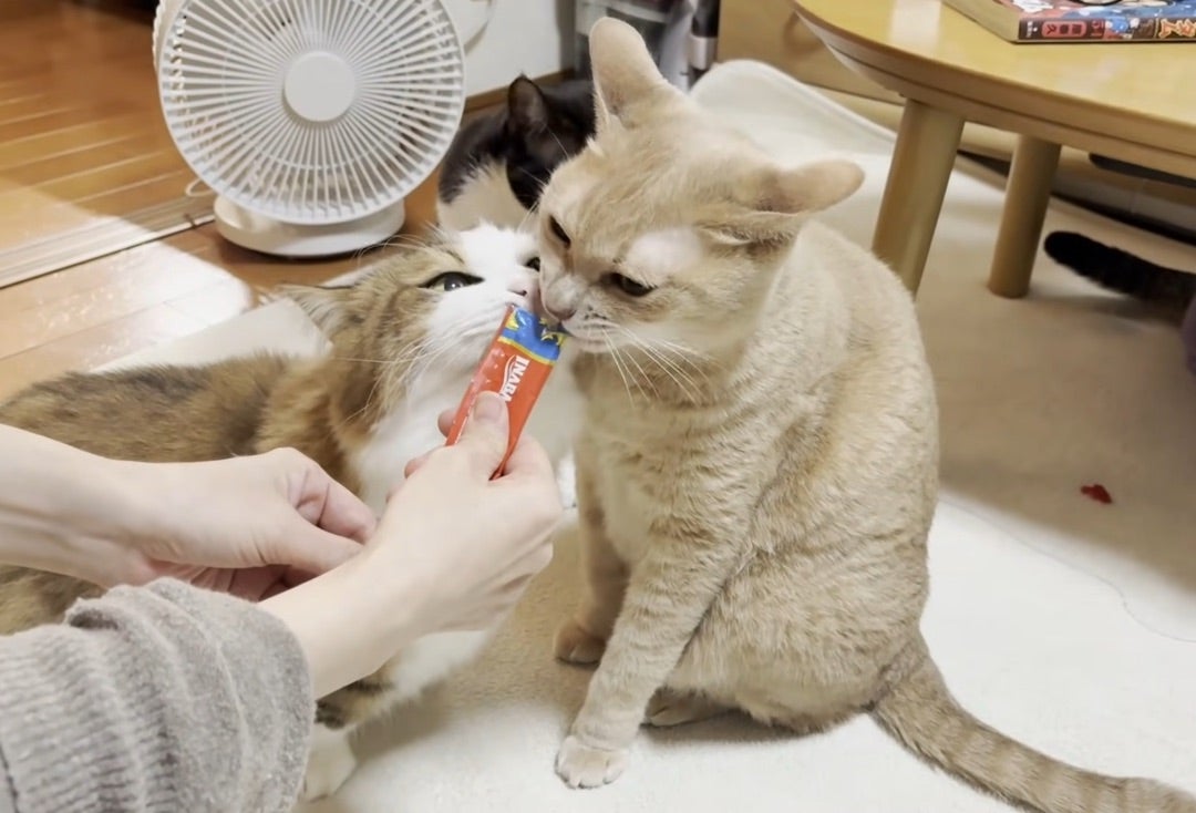こんにちは。お母さんです。ひのき猫のことをよくご存じな皆さん!驚きませんでしたか!?これ!!いやもうビックリですよ今まで秀吉がいたら、いくらちゅーるが欲しくても近寄って来ませんでしたから!今回みたいにひのきが食べてて、秀吉が近寄って来た時も同様、近寄る秀吉が気になりすぎて食べない、みたいな。それがそれがですよ!こんな、ベロとベロがベロベロするくらい近くて、一緒に食べてるなんて!!まさに奇跡それもこれも多分、あのおもちゃのおかげやと思います少し前にアップした、めっちゃ遊んでたおもちゃです。珍しくひのきにハマってくれたおもちゃ。オマメにももちろん好評で、秀吉、オデコも一緒に遊んでくれるおもちゃ。残念ながら、ひまわりにだけは全くハマってないんですがwでも、あれで一緒に遊ぶようになってから、何気に距離が縮まったような気がしてたんです。気のせいじゃなかったってことですよねまぁでも、その後も仲ええんか?って聞かれたら、全然そんなことないんですけどwwめっちゃシャー言われてるんですけどただ、絶対に近づかなかった時に比べたら、一歩前進や思ってます今回本当は、オシャレ豆の第2弾撮ってるつもりやったんですけどね(笑)切りっぱなしの裾も縫いましたし。全部ひのきと秀吉に持って行かれたオマメでした ポチッと応援宜しくお願い致します。