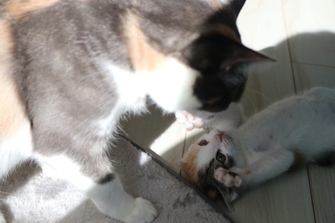 だいたい子猫案件が春夏に来て巣立つことになり、先住猫のいる里親様の元へ行くとなると課題はその瀬住猫と仲良くなれるかです。里親様から様子をお送りいただき、最初は唸っててもだいたいはお許しが出て早ければ一緒に遊んだり、遅ければ付かず離れずになったり。巣立ちは大抵まだまだ子猫の時なので巣立った猫の感性も柔軟ですし、里親様宅の先住猫の方もそこまで子猫に怒る事はまずないからです。そして、だいたい秋冬で仲良くなるというご報告をうけることが多いようです。理由は端的に暖房の効いてる良い場所に集まりやすいので距離感が縮まる、そして猫団子が最強の防寒だからですね。春夏でなかなかくっつかないとご相談を受ける事がありますけど、いがみ合わなければ秋冬で何とかなる可能性が高いですという感じでご案内してます。たぶんこれは野良とかでもそうなんじゃないかと思います。怒る余裕がないともいえそうですが。翡文と釿汰ですら膝上はシェアするものと学習してます。子猫は兄弟姉妹は真夏でもくっついて寝ますが、巣立つ頃には遊びたいの方が強くなってなかなかくっつくことはないかもしれません。なので、春夏の時期でもくっついてるのが本当に仲の良い猫同士ということでもあります。猫たちが仲良くなるには気温が低い時期がチャンスです。