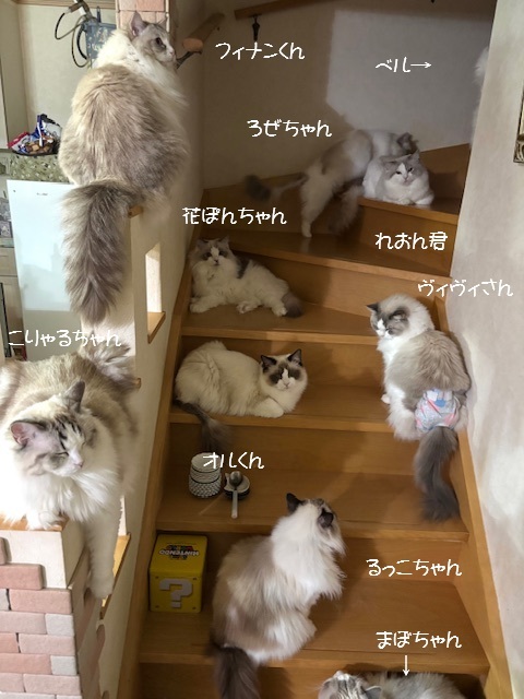 毎晩恒例大渋滞な階段です。みんにゃ、はなぴんを待ってます・・いや、缶詰を待ってるが正解かな(笑)みんにゃで分けるから、スプーン一杯程度なんだけどこの一瞬に懸けてるのがりあん君。ものすごい執着です(;'∀')はなぴんが階段を歩けば同時に動くにゃん達。階段のぼるのがめっちゃ大変です💦☆;+;。・゚・。;+;☆;+;。・゚・。;+;☆;+;。・゚・。;+;☆;+;。・゚・。;+;☆今日は雨で室内は暗い(-_-;)朝、何気に撮影した一枚。よーく見たらファミリーです。(りあんはパパ・あっちゃんはママです)ゴミを捨てて帰る途中まぼちゃんが見えた✨可愛い♡戻ってくるとケージ上にオルくん・中にフィナンくん。室内が暗いので電気をつけてたんだけどそれでもボケる(-_-;)でもフィナンは可愛い(*´▽`*)☆;+;。・゚・。;+;☆;+;。・゚・。;+;☆;+;。・゚・。;+;☆;+;。・゚・。;+;☆今日も動画鑑賞をしてる3にゃん。ろぜちゃんはすぐに飽きたっぽい。はなぴんの足元にはベルちゃん。ベルはふっこちゃんと同じ行動をするのでふっこちゃんがまだ家にいる感じがします。☆;+;。・゚・。;+;☆;+;。・゚・。;+;☆;+;。・゚・。;+;☆;+;。・゚・。;+;☆お手手ピーンのこりゃるちゃんと足ピーンほっぺたん。ほっぺたんは前手ピーンはないかも。訪問ありがとうございます