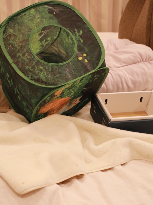 様子を見に行ったたけがカメラを取りに戻ってきたので見に行くとこんなことに。ベッドにかけてある毛布が盛り上がって姐さんの出前先になっている桃箱や緑のテントが傾いておる…。
