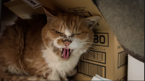 猫にはそれぞれ得意な時期と体調を崩しやすい時期があります。どんなにエアコンを効かせててもだいたいは夏に崩しやすい傾向があるように思います。2017年秋に保護、2018年夏に突如チアノーゼを起こして危篤に陥り蘇生措置。そのあとは明らかに体調は悪そうながらも2022年も乗り切った栗白。ずっと部屋の奥の隅にいた栗白が、チャー坊の終末期を機に入口前のベンチ下付近にいるようになりました。何か思うところがあったのでしょうか。そして2022年12月なかばから食事中に限って背中のケアができるようになりました。まずはブラシ、そのあとにシャンプー。こうしてグルーミングできず固くなってしまった毛皮をきれいにして柔らかくする日々が続きます。この時期も並行して釿汰の喉の炎症はあり、ステロイド注射を2ヶ月に一度くらい打ちに行ってました。チャー坊の他界で思うところがあったのか、薬を混ぜたフードを一緒に食べるようになったので少しずつ注射の周期は延ばせていました。これは2022年10月頃の栗白。夏に体調を崩して10月に少しずつ回復してる時期とはいえ顔周りが非常に汚れてます。こちらが2023年1月。体調に余裕ができて顔つきもやや穏やかになりました。顔ケアができると言っても、やはり全てをきれいにするのは至難の業。口内に問題があるので、強くやりすぎるのもできないんですね。こうして釿汰と翡文がいるうちで、栗白がベンチ下付近