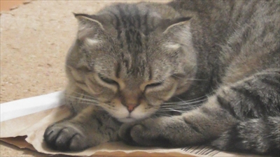 今回もクイズ形式。ちゃんと唯一の答えがあるので御安心を。(答えのないクイズは → こちらの過去記事)次の画像で、りんの顎の下にある、先が一番向かって左側にあるのは、おてて?あんよ?右?左?まず、画像。左 右※ 左右の「左(右)」は向かって左(右)を表す。以下同様。では、答え合わせ。最初は、おててかあんよか?引きで見てみると、こんな感じ。左 右顎より下側にあって、手前に見えているのは、左から、 (左) 問題のおててかあんよ (中) 先が顎先にあるおててかあんよ (右) しっぽ先が顎先にある(中)は左のあんよであることがわかる。元の画像でも先から根元の方へ辿っていくと、ちゃんと腰に繋がっている。最初の画像で(中)を辿っていっても肩に繋がっているとは考えにくい。なので、(中)はおててとは思えない。問題の(左)は右のあんよか?(中)があんよで、腰は最初の画像の右端の外にある。右のあんよを体の下敷きにして、腰から向かって一番左まで先を伸ばすのは、短足のりんには物理的に非常に困難である。なので、問題の(左)は、おてて。では、右のおてて? 左のおてて?問題の(左)を拡大して見てみる。左 右長い黒い線(スリット)3本と、短いのが1本の計4本見える。一番左側の長いスリットは輪郭ギリギリなので見にくいが、左から順に、長、短、長、長である。長いスリットは指の間、短いのは爪の出し入れのスリット。この