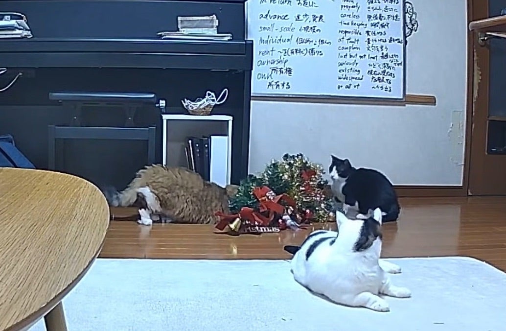 こんにちは。お母さんです。たった半日で破壊されたクリスマスツリー、笑っていただけましたか?何か起きるであろうと、監視カメラをセットしてて良かったです(笑)ただ、思ってた破壊方法でなかったので、正直ビックリはしましたが。まさかね、根本に立たないようにされるとは朝起きて、本当に「終わった」って思いました。もっとこう、踏みつけられたりして、ぺったんこになるんか思たらねw思ってた斜め上に行くのが猫ですよねwwでも犯人は、予想通りで、、、今回は豆とひまわりでしたけど、あと可能性として、きっかけを作るはオデコあたりかなと。何にせよ、ひのきはあんまり関わらない感じで、クリスマスまであと3週間くらい、秀吉一家には要注意です。っていいつつ、昨日も言いましたが、ぺったんこのツリーが見たい気持ちもあり、wwオーナメント全部、オマメの好きなおもちゃにしたろかなとか、ツリーで遊んでくれるのを期待してるお母さんですとりあえず今回は、お父さんが3Dプリンターで作ってくれたおかげで、事なきを得ましたむしろしっかりしました(笑)明日はどうなってるか、楽しみです。 ポチッと応援宜しくお願い致します。