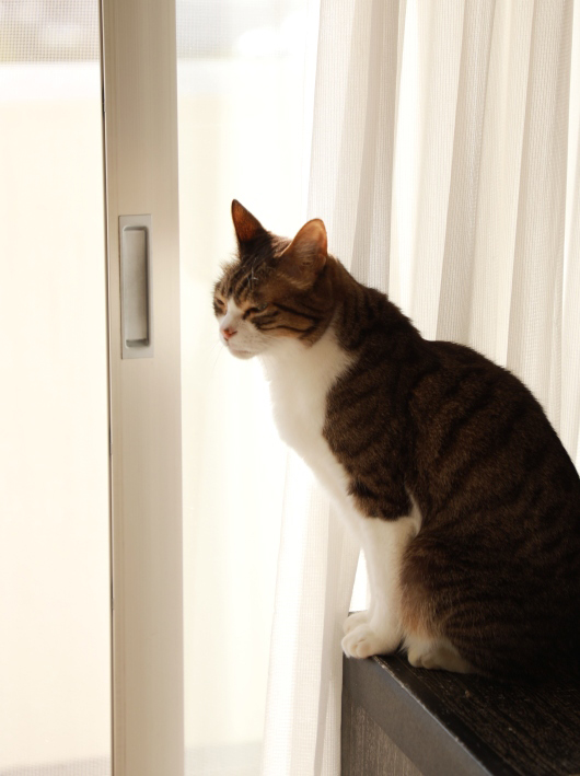 窓辺の箱に寒がりなアミ姐さん登場。窓を開けるとすんすんしたがりのユウも眠そうな目でやって来ます。日光浴でほかほかになると姐さんはキャットタワーのてっぺんへ