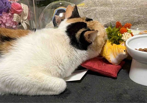 釿汰が他界してのこしたもの…というのは功績ではなくて物質的な意味です。へいへいおっちゃん、ずいぶん小さくなってちんちくりんのプーになったのです。悔しかったらシバいてみろなのです。翡文にのこしたものは大きかったというか、あんまり翡文も気にしてないのでここに釿汰の気配がまだ残っているからだと思われます。さて、その釿汰がのこしていったものといえばこちら。8月の足の負傷の際の動物用包帯、軟膏、動物用ガーゼ、消毒綿。そして、使っていたエリザベスカラー。包帯等(軟膏以外)は万一ほかの猫が怪我した時に何らかの形で使えるかもしれませんが、エリザベスカラーは釿汰のよだれが散々ついてしまったので廃棄するしかありません。あたしの育てる小麦を狙う怪しいおっちゃんは「事業拡張の世界進出のためここを発ちます」って言ってたゃぃ。怪しいから覗いてみたらなんか珍妙なミケミケがいるゃぃ…。琥麦もひとりになった翡文が気になるようです。あっ、ミケミケ同盟の会議はまた今度なのです。いまは忙しいのです。思えばキャリー越し対面くらいだった翡文と琥麦。翡文の所にあるのは釿汰の便秘用の流動パラフィン。あとはある方に頂いた回復用療法食など、食べるか否かで試行錯誤したフードが色々と入ってます。火を使わないお灸などもあります。食べなかったフードは御供えした上で翡文が食べます。翡文のメンタルから不調に陥らないかと注意深くみてる中で顎下を拭