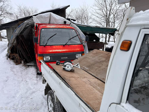 なんちゃっ庭の除雪はなんとかなるがなんちゃっ亭の除雪は厳しいものになる。てことで松本君を改造。 汚いコンパネを組んでみる。後ろから見ても汚いものは汚い。もらいもんのビニールを張ってみるが汚いものに汚いビニールを張ってもやはり汚い。(;´Д`)言うてるうちに雪が降り始めた。 ビニールを張ったことでダンプしたら雪が滑り落ちるかな?