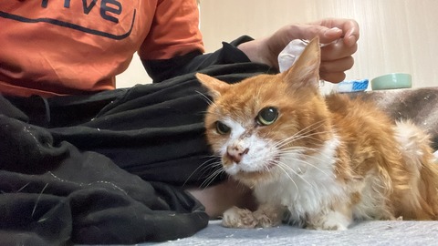 2024年9月15日に他界した女王猫・栗白。その保護以降の主役エピソードの再生リストがこちらです。エピソードはかなり端折ってます。特に9月の場面は釿汰が栗白を見守る場面だけです。一般公開では栗白の女王猫の姿だけを残したいからです。これは8月中旬の栗白。耳を出すタイプの被り物はいけた栗白。8月9月は実はかなり甘え倒しで、ケア時は栗白をずっと磨いてました。肉は食べてましたが、ステロイド錠剤は飲む事ができなくなり、この時点でもう無理はしないで栗白の意思を尊重する感じにしました。8月以降は体調にも波があって、厳しいかなと思う日と目に輝きが戻る日が交互に訪れました。大丈夫な時はこうして顎下を撫でてました。喉と気管周辺の異常、あとは2018年の検査で解った心臓付近の不調があったかもしれません。脱水の仕方が黒慧と非常によく似ていました。その様子もここが定位置で膝に甘える感じで変わり映えがしないというのもありましたね。それでも細かく刻んだ馬刺しを食べてました。他の肉系のフードはダメなのに何故か肉は喉を通るという状態で8月を乗り切りました。あとは流動食とちゅーるですね。最期の食餌も総合栄養食ちゅーるでした。胃腸は強かったのでしょうね。脱水がひどく硬いながらも排泄はできていました。その栗白を見守っていた釿汰の表情。なんとなく、釿汰の表情は自分のものと同じだったのではないかと思う時があります。釿汰と栗白