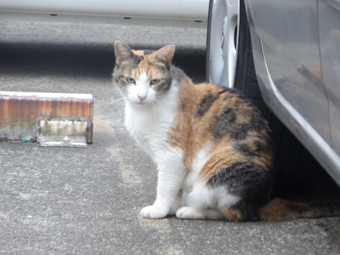 女王猫・栗白の老猫一家の一員だった置物三毛ことミーちゃん。世話人様のお話だと、老猫一家の一員ではありましたがどこからか流れてきた猫で、老猫一家も同居を迎え入れて一緒に暮らしてたようです。灰覆面ことグレーとは家族愛ではなく本当に夫婦の愛だったという事ですね。置物三毛ことミーちゃんは私だけでなくこの道を通る人たちにも注目の的で、世話人様が家に迎え入れた時も「あの子に何かあったのですか?」と聞いてくる人が多いので、動画中の貼り紙をされたそうです。みんな口にはしないですが、猫がいた頃を懐かしく思い、減っていくのを寂しく思っている人も多かったのだろうと思います。2013年頃、ちょうどこの辺りの駐車場で夜に集会をしてたのが老猫一家との初遭遇だったと記憶しています。その時も少し栗白がやや離れていました。置物三毛はたいてい車の下とか塀の上で静かにしてたはず。2014年の記録くらいからほぼこの場所にいる感じになってました。やはり5年近く同じ場所にいたら、大抵の人は「いつもそこにいる猫」となりますね。街の片隅を彩った街角小町でした。2020年5月なかばに世話人様のおうちの猫「ミーちゃん」になってからは色々とケアしてくださり、2023年12月14日に心臓疾患で永眠とのこと。2013年夏には猫としては割と落ち着いた態度だったのでこの時点でそこそこの歳の可能性が高く、天寿を全うしたのは間違いありません。まず