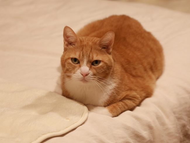 すぐには寝室に入らなかったのでしばらくして様子見に行くとベッドの上にユウ。そしてアミ姐さんの入っているどら焼きベッドが軽くつぶされている?( ̄▽ ̄;)パンケーキベッドも