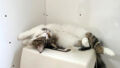寝ながら器を抱えてごはん食べてはります。座ると体力消耗するから? 省エネ食事法なのか?