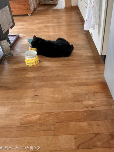 寝ながら器を抱えてごはん食べてはります。座ると体力消耗するから? 省エネ食事法なのか?