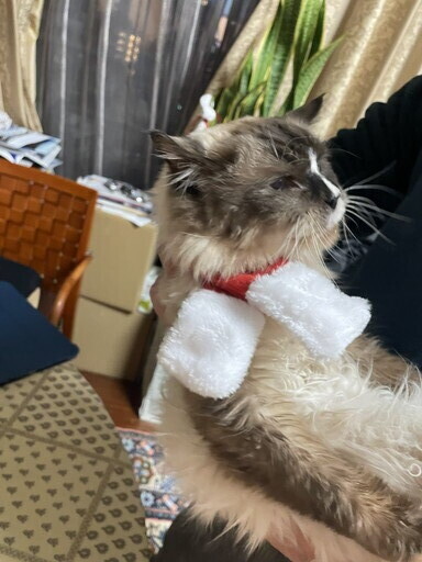 こんにちはくうです今回はクリスマスとボクのお誕生日のお話です少し日が経ってしまいましたが・・・24日にクリスマスパーティーやりました今年のお料理はこちら写真上から時計回りにアボガドとミニトマト・モッツアレラのカプレーゼサラダ大根、カニカマのサラダ、星形のお麩を彩りにブレッドストーリーのサラダサンドチーかまと胡瓜のオードブルそしてメインディッシュのミートローフですミートローフの断面はこちら、カボチャのピューレを添えて頂きますそしてくうおばちゃんお楽しみのクリスマスケーキ今年は日本橋高島屋のアトリエ・アニバーサリーさんのです見た目も可愛く、甘すぎないさっぱりとした味、とっても美味かったです続いて26日はくうの19歳のお誕生日大好物の東京会館のプリンを召し上がりましたもちろん少しだけ・・・大満足のご様子でしたこれからもずっと健康でいてね今回が年内最後の更新となります、更新頻度が減って中身もイマイチのブログにお付き合いいただきありがとうございましたみなさまも良いお年を、来年もよろしくお願いいたしますクリスマスには変なもの着せられて写真を撮られましたこれはイヤイヤしているボクです締めくくりにはイマイチでしたね来年もよろしくねラグドールブログランキング参加中楽しんでいただけましたらクリックしてね、はげみにしてガンバリますにほんブログ村ランキング参加中、ポチット 協力お願いします