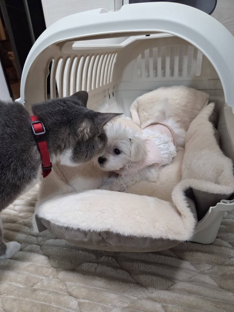 因縁の猫一族から託された子猫・モナさん。里親様からモナさんの状況のご連絡を都度いただいてます。2025年7月3日にモナさんを育ててくれた先住犬・ルークさんが他界し、悲しみに暮れた後、里親様ももう飼わないつもりだったそうなのですが縁あって子犬をお迎えする事になりましたとご連絡をいただきました。名前は女の子なので「ルナ」さんとのこと。はたしてモナさんはルナさんを受け入れてくれるのか…?ルークさんに育てられて自認が犬と思われるモナさんはそう時間もかからず寄り添ってくれたとの事でした。うちにいた時は黒イモたちに戸惑うばかりだったモナさん。興味はあったけど寄り添い方がわからない様子でしたが、ルナさんへの態度と比較するとやはり里親様がいうとおり自認・犬のようです。ルナさんをケージに入れても、そのすぐそばで寄り添っているとの事でした。やはり、ルークさんにしてもらった事を継承しようとしてるんでしょうね。我が家にいた頃のダイナモ子猫具合が懐かしくもあり、ただ猫も出会いと別れの中で内面が成長していくのをモナさんをみてても感じます。また末長く仲良く健やかに共に過ごせますように。里親様に感謝ですね。