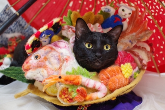 お正月豪華な盛り合わせはどうですか?『魚の真ん中にあんころもち付き』けっこう大変な羊毛フェルトなんだけどあんこ良い子につけてくれました。ぷぷに応援ありがとうございます。お正月コスプレも出来ない代わりに昔の激かわ晴れ着姿を(2012年)『今年もよろしくねー』31日の早朝、口呼吸になりかなりしんどそうになり酸素室に数時間。一旦呼吸は安定し、出たがるから酸素室を出し過ごしていましたが・・・全く甘えても来ないしずっと不機嫌な顔してて夜、8時頃ぐっすり寝てるものだと思ったら・・・また口呼吸してたんです。大晦日の夜から元旦にかけて酸素室の中でした。呼吸が安定したらすぐに出たがるんですよ。早朝に出しました。数日はカロリー取れるご飯食べれなくて・・・チューブダイエットのキドナをしゃばしゃばに湯で溶いたのを試しに出してみたらビックリ。自ら飲んだー――っ。これでカロリー取れる。昨日は何度も自ら飲んでくれました。その後は3枚目の様な様子で殆ど下で過ごしています。殆ど動きません。天袋にも一度も行こうともしませんでした。(胸水あるのかな??)4日までなんとか落ち着いて欲しい。追記 今朝、目力が出てカリカリを食べだしました。(いつものウェットは完全拒否)ただ動くのはしんどそうで一日中殆ど同じ場所にいます。まさか大晦日に酸素室が再復活するなんて想像もしてなかったけど・・・あんころもち大喜び💦ぷぷ