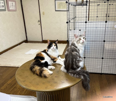 <はじめておいでの方へ>メインクーンキャッテリーCAVALLINOへようこそ。日々の出来事や子猫情報などを綴っています。大家族ですので、わが家の家族紹介No.1とNo.2をご覧下さい。ペトハピ 太鼓判ブリーダー に掲載されました。クリックすると見られます。独りぼっちなんて書きましたが・・・・・一人だと自分の予定ですべてが動く。それもまたよし。大家族の母は年中無休。あ、年中無給とも言えますが(笑)やる事はいっぱいある。ちょっといいカップルかなあって思ったこのお二人。仲良く遊んでいたんですが・・・・・ある時、走り回る音で部屋の戸を開けたら・・・・・ミィがタレンティを追いかけたおしていた(笑)何しろミィは女の子としては大柄。6.5kg以上あるはず。タレンティとは1kgも変わらない。ミィがそれに気づいちゃったんですね。ミィは自分の部屋に・・・・・成田離婚ってあったなあ(笑)傷心のタレンティには・・・・・・シャンプーをプレゼントしました。「ソンナコトシナクテイイ」大晦日からシャンプーの神様が降臨していまして・・・・空もばっちりきれいになりました。さあ、次は・・・・・・「やめろよぉ~~」お母さんの耳はお正月は聞こえなくなるのよ(笑)ラピ蔵、ご愁傷様。さて、次は誰かな? ランキングに参加しています。バナーを2つポチ