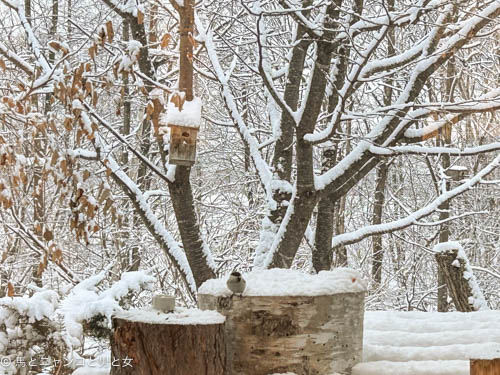 昨晩からの積雪で食べ物が見つからなくなったか野鳥食堂一番乗りで待ってるコガラ。